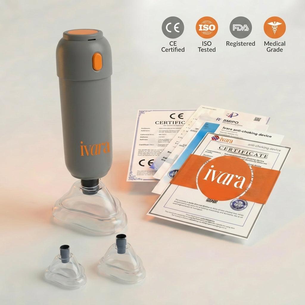 Ivara's anti-choking device is a clinical-grade anti-choking device that removes airway obstructions in seconds using suction — not force. Unlike the Heimlich, which pushes, this device pulls the obstruction out of the airway. It works independently of your strength, your technique, and your emotional state under pressure. It can be self-administered if you're choking alone. Does not expire.